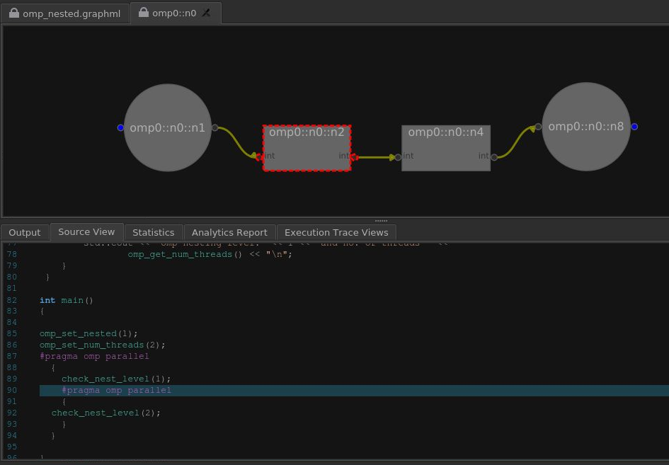 All OpenMP-related parallelism is contained within OpenMP parallel regions. In the Flow Graph Analyzer, a parallel region is mapped to a subgraph node in the graph canvas. Inside the subgraph node are at least two nodes: