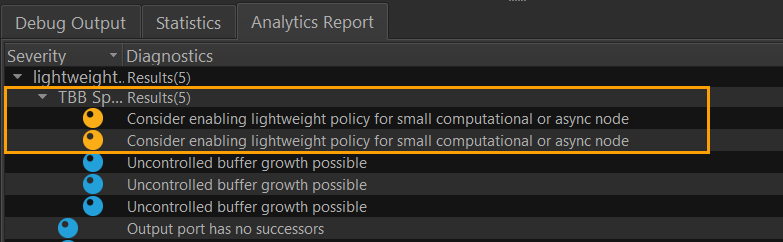 The Flow Graph API allows you to apply lightweight policy for computational nodes such as function node, multifunction node, continue node, and async node. Enabling the lightweight policy helps reduce scheduling overhead. It can limit parallel execution of tasks, so apply this policy on a per-node basis after careful evaluation.
