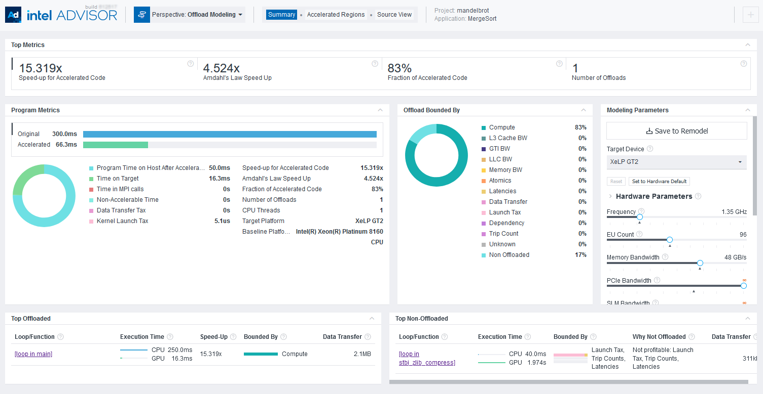 - An interactive HTML report that represents results in the same structure as in graphical user interface (GUI) and enables you to switch between Offload Modeling and Intel Advisor perspective results if you collect your data for an application running on GPU.