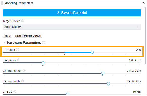 When you open the Summary tab of the Offload Modeling report in the Intel Advisor GUI or the interactive HTML report, you should see the Modeling Parameters pane, which shows the current modeled device and its parameters. Each parameter is a slider you can move to change its value.