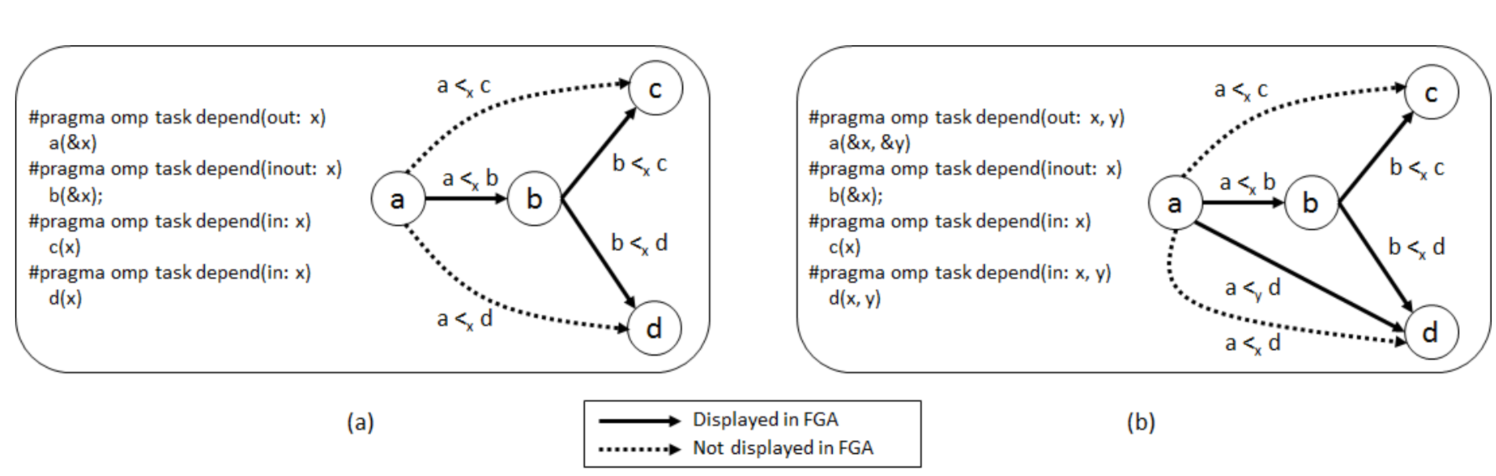 The task dependency graph represents the partial order set by the depend clauses for the OpenMP tasks executed by the application. The nodes in the graphs are OpenMP tasks and the edges represent the partial order.