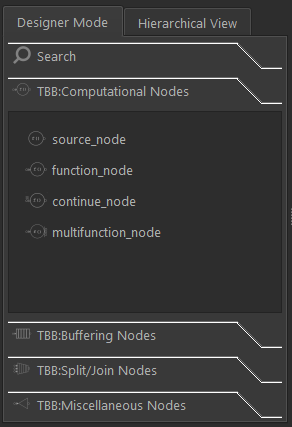 Designer Mode tab: Shows the available node types you can use to construct a graph. This tab might change when new nodes are added to a Intel® oneAPI Threading Building Blocks (oneTBB) flow graph interface. For more information about each node type, use the What’s This? functionality on the node-type buttons.
