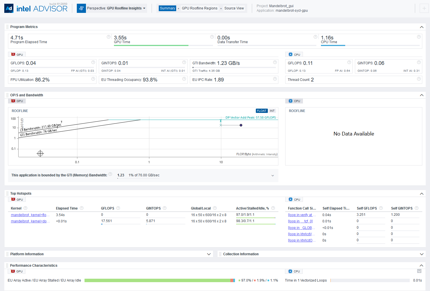 Identify top hotspots and room for optimization of your application running on GPU using a Roofline chart and view the application execution and performance details in the Performance Metrics Summary drop-down section.