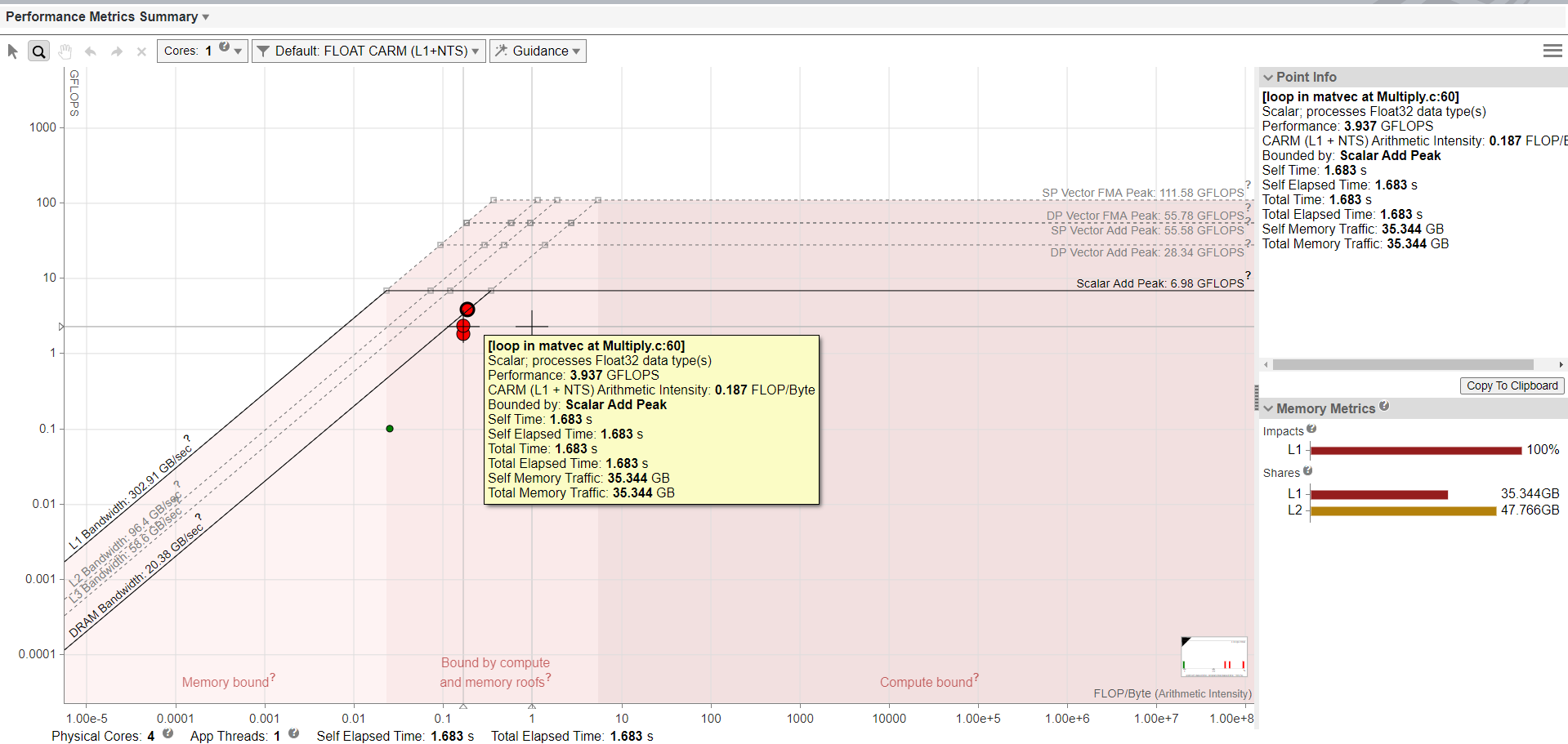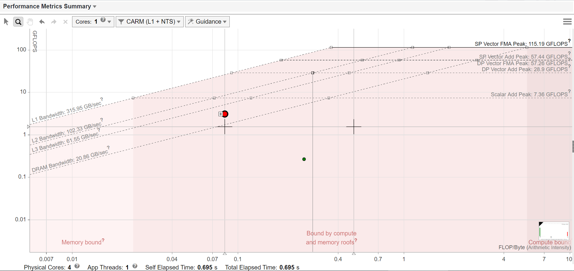 For more information on interpretation of Roofline charts, see Examine Bottlenecks on CPU Roofline Chart.