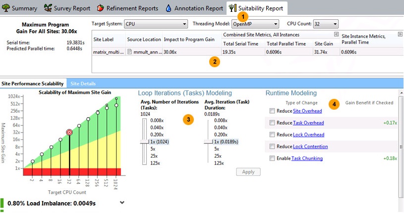 This screen shows data based on a Target System of CPU. The screen shown on your system may differ. If you use other Target System values for the Intel® Xeon Phi™ processor, additional modeling values appear. See Suitability Report Overview.