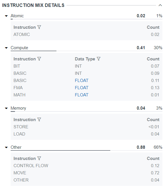 - Examine instruction count for each type of compute, memory, atomics, and other instructions.