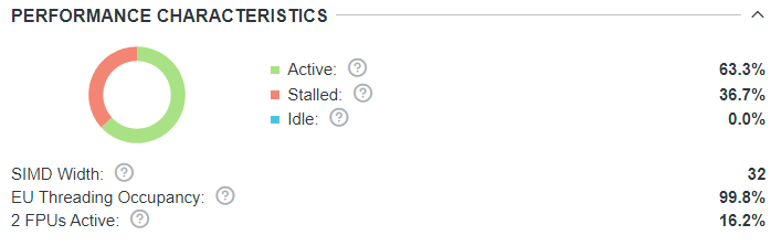 In the Performance Characteristics, review how effectively the kernel uses the GPU resources: activity of all execution units, percentage of time when both FPUs are used, percentage of cycles with a thread scheduled. Ideally, you should see a higher percentage of active execution units and other effectiveness metrics to use more GPU resources.