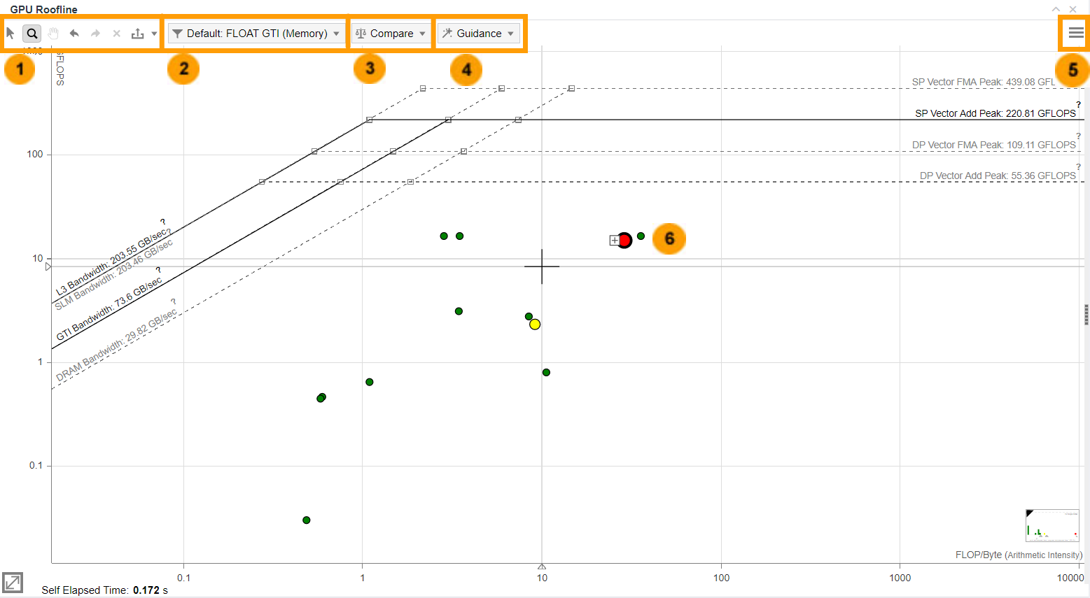 There are several controls to help you focus on the GPU Roofline chart data most important to you, including the following.