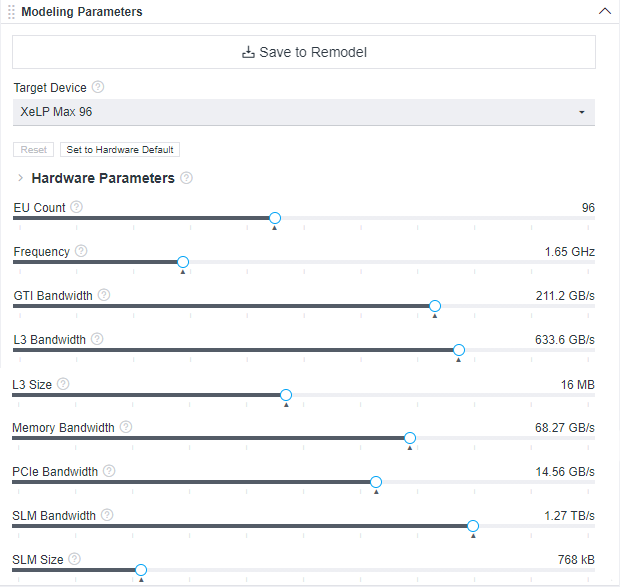 When you open the Summary tab of the Offload Modeling report in the Intel Advisor GUI or the interactive HTML report, you should see the Modeling Parameters pane, which shows the current modeled device and its parameters. Each parameter is a slider you can move to change its value.