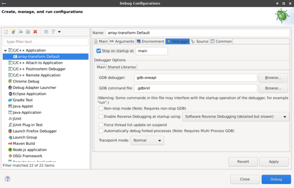 In the Debugger tab, set the GDB debugger to gdb-oneapi instead of gdb.