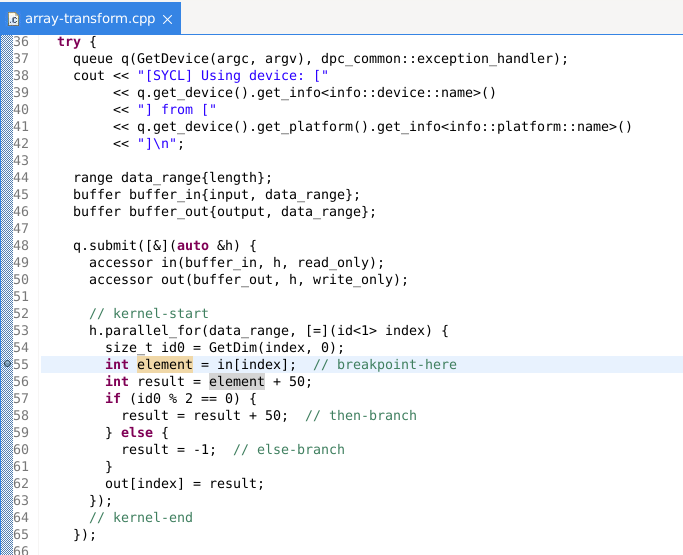 Add two breakpoints in array-transform.cpp one on line 32 and one on line 55 by double-clicking the margin just left of the line number in the source code editor. See the image below.