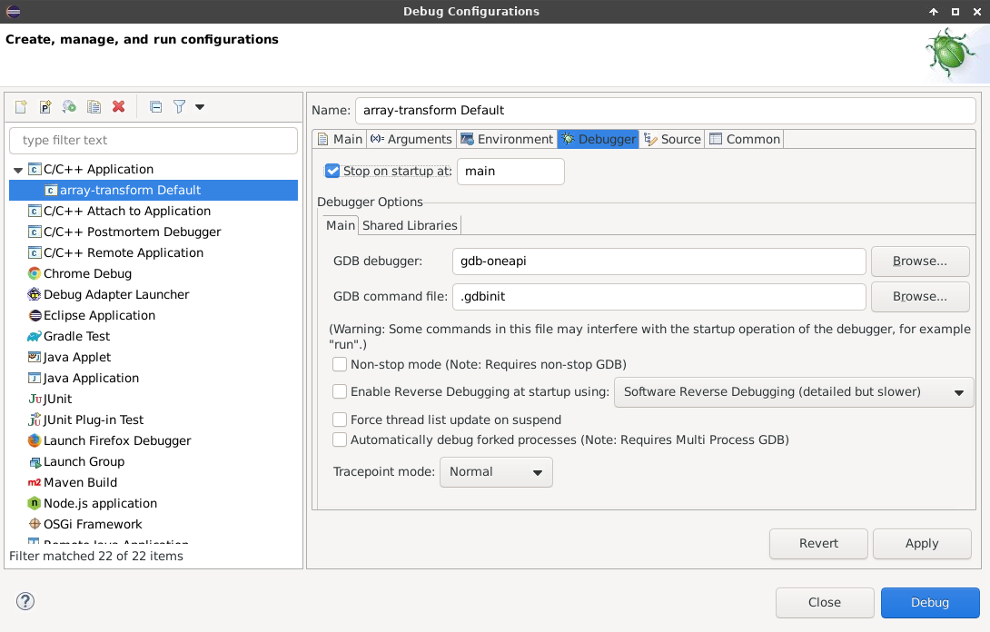 In the Debugger tab, set the GDB debugger to gdb-oneapi instead of gdb.