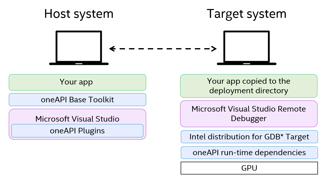 For remote GPU debugging, two Windows systems are required: a host and a target. Visual Studio and the Base Kit must be installed on the host system. The application is deployed and run on the target system. Install the latest GPU drivers and configure your target system to use them.