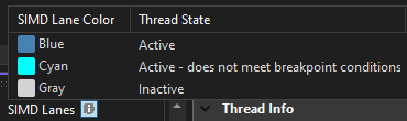 You can view SIMD lane color scheme by clicking the information button next to SIMD Lanes column in the oneAPI GPU thread window. This opens a popup that signifies the meaning of each color.