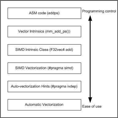 The following figure illustrates how SIMD vectorization is positioned among various approaches that you can take to generate vector code that exploits vector hardware capabilities. The programs written with SIMD vectorization are very similar to those written using auto-vectorization hints. You can use SIMD vectorization to minimize the number of code changes that you may have to go through in order to obtain vectorized code.