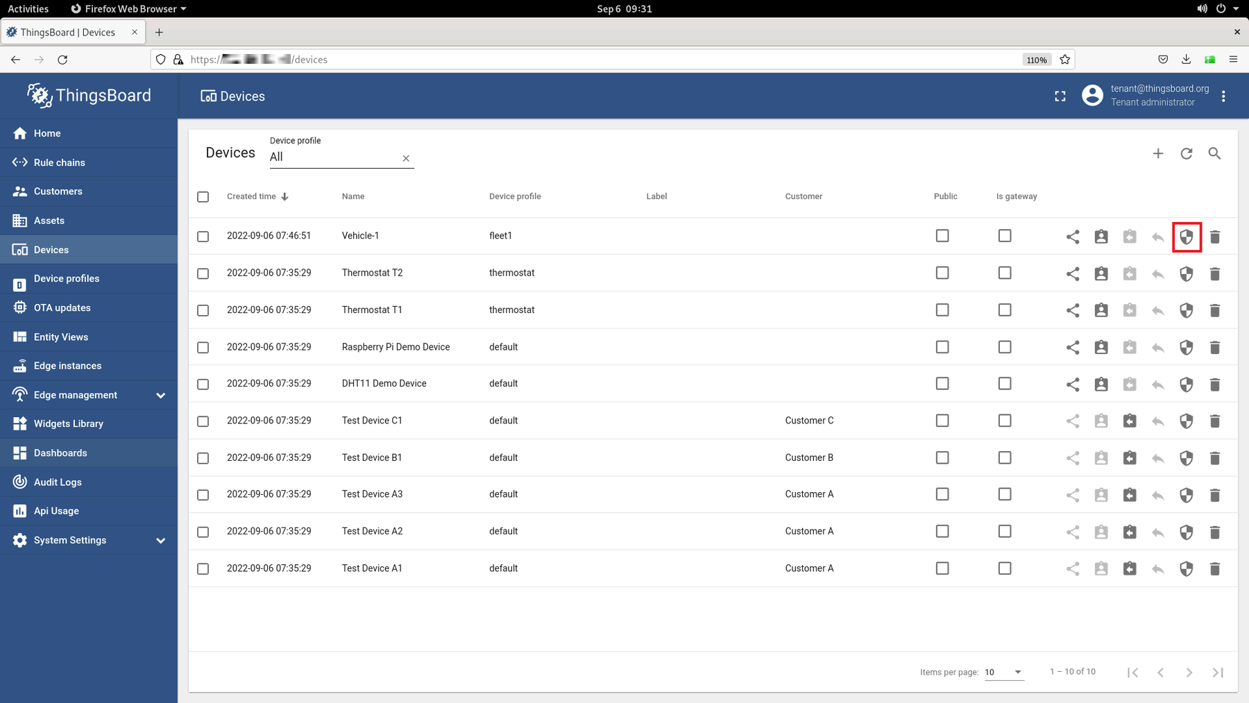 NOTE:ThingsBoard* can also be set up on a local host if AWS is not a viable option.On the ThingsBoard* page, go to Devices. On the device list, click on the shield icon to find out the credentials of a device:
