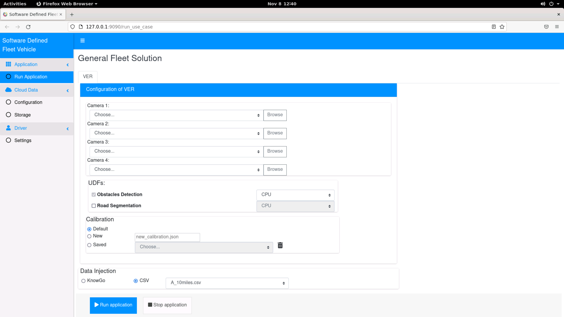 The Fleet Manager is able to configure every reference implementation from a single web page: 127.0.0.1:9090. During installation, all reference implementations are added to the default group named “General-Fleet-Solution”. After the reference implementation installation is completed, you can navigate to 127.0.0.1:9090 web page and have a sub-menu on the Run Application main page with each reference implementation’s abbreviated name. (For example, Vehicle Event Recording will appear as VER and Driver Behavior Analytics will appear as DBA.)