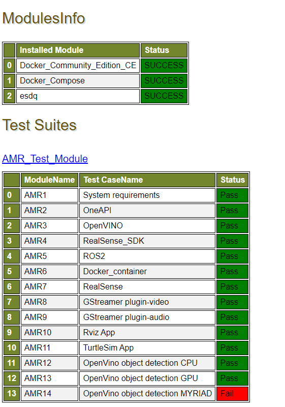The EI for AMR Test Modules interacts with the Intel® ESDQ CLI through a common test module interface (TMI) layer which is part of the Intel® ESDQ binary. Intel® ESDQ generates a complete test report in HTML format, along with detailed logs packaged as one zip file, which you can manually choose to email to: Edge.Software.Partners@intel.com