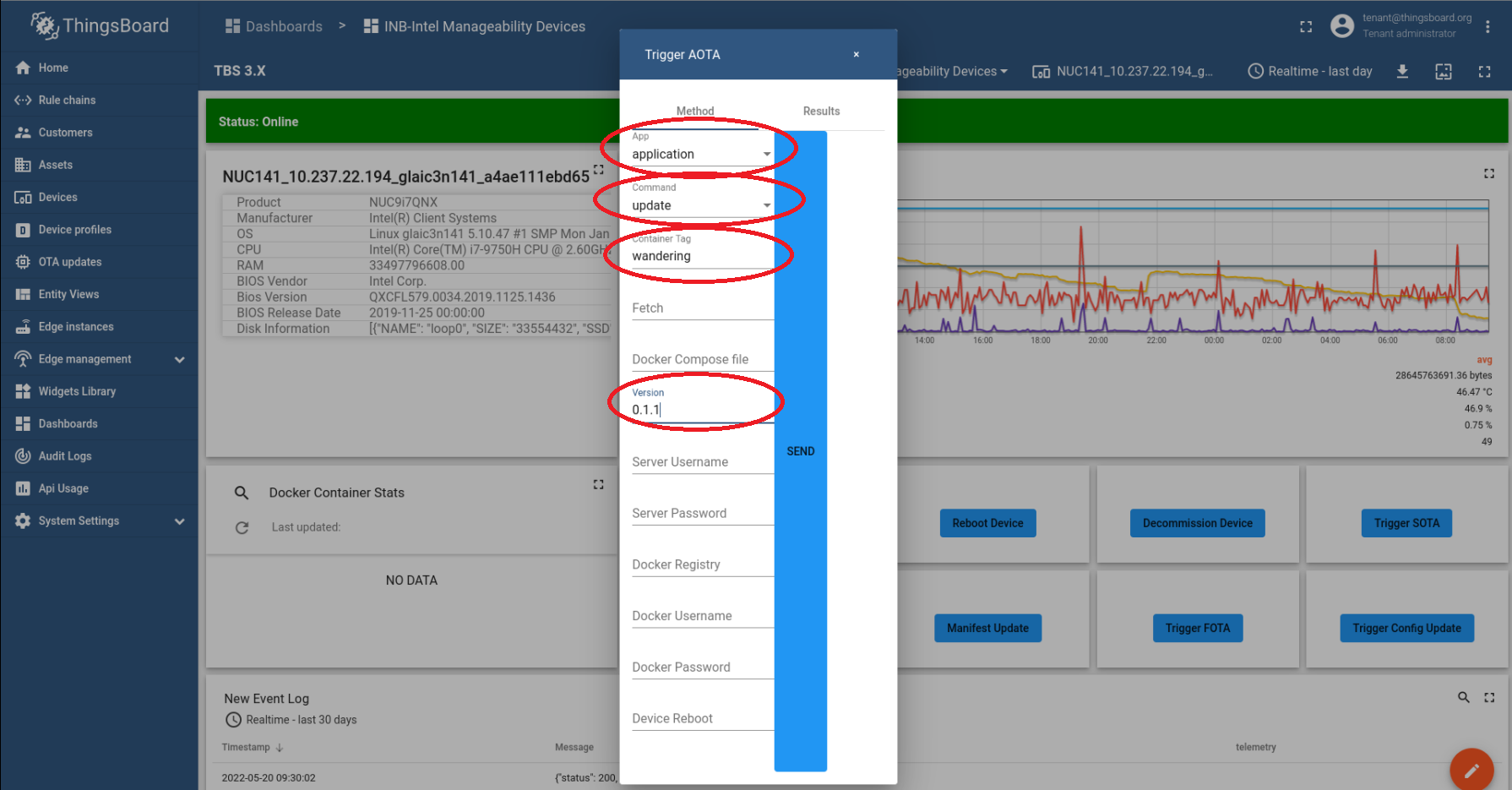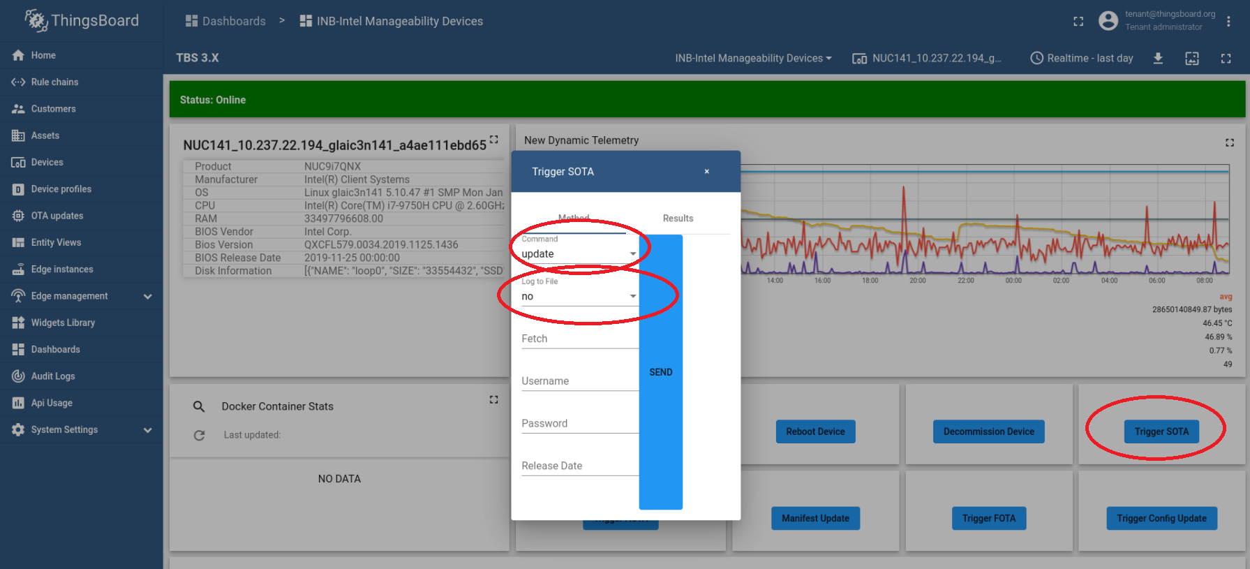 On the ThingsBoard* dashboard, click Trigger SOTA, select update, and click SEND. Update progress is visible in the ThingsBoard logs. The client host reboots after SOTA completes.