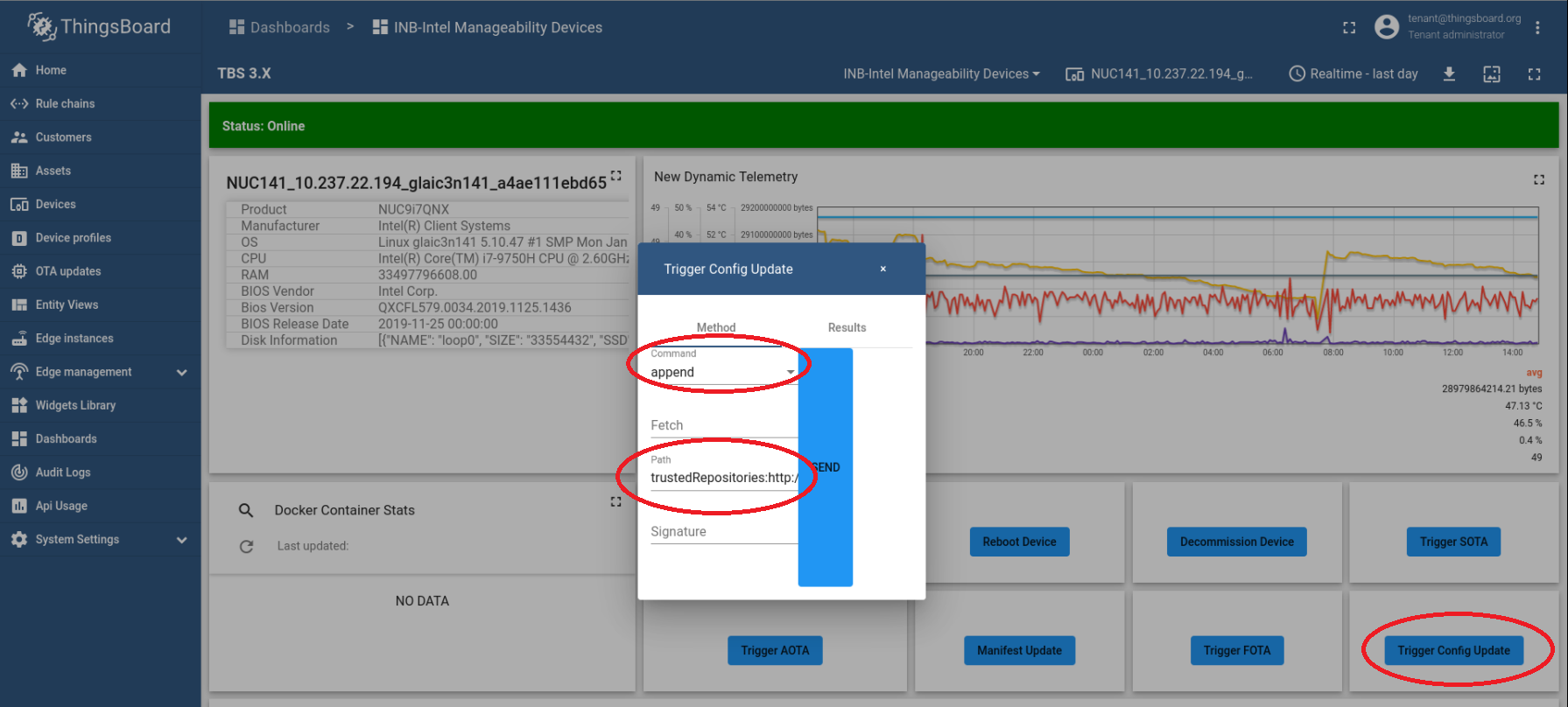 On the ThingsBoard* dashboard, click Trigger Config Update.
