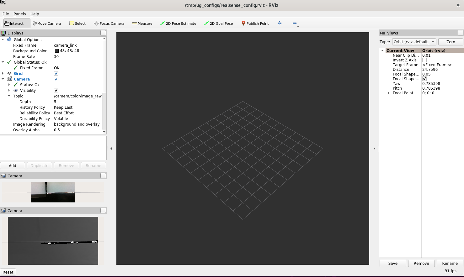 Expected output: The image from the Intel® RealSense™ camera is displayed in rviz2, on the bottom left side.