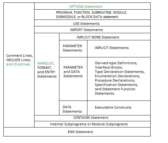 The following figure shows the required order of statements in a Fortran program unit. In this figure, vertical lines separate statement types that can be interspersed. For example, you can intersperse DATA statements with executable constructs.
