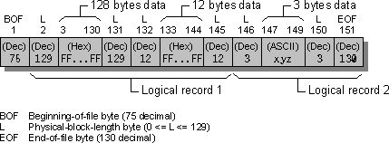 The records in an unformatted sequential file can vary in length. Unformatted sequential files are organized in chunks of 130 bytes or less called physical blocks. Each physical block consists of the data you send to the file (up to 128 bytes) plus two 1-byte "length bytes" inserted by the compiler. The length bytes indicate where each record begins and ends.