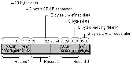 A formatted sequential file is a series of formatted records written sequentially and read in the order in which they appear in the file. Records can vary in length and can be empty. They are separated by carriage return (0D) and line feed (0A) characters as shown in the following figure.