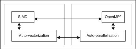 User-mandated or SIMD vectorization supplements automatic vectorization just like OpenMP parallelization supplements automatic parallelization. The following figure illustrates this relationship. User-mandated vectorization is implemented as a single-instruction-multiple-data (SIMD) feature and is referred to as SIMD vectorization.