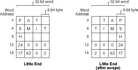 If you serially transfer bytes now from the big-endian words to the little-endian words (BE byte 0 to LE byte 0, BE byte 1 to LE byte 1, and so on), the left half of the figure shows how the data ends up in the little-endian words. Note that data of size one byte (characters in this case) is ordered correctly, but that integer data no longer correctly represents the original binary values. The right half of the figure shows that you need to swap bytes around the middle of the word to reconstitute the correct 32-bit integer values. After swapping bytes, the two preceding figures are identical.