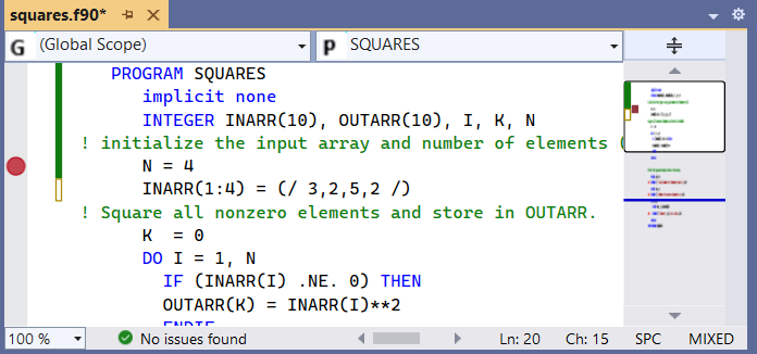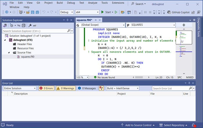Edit the file squares.f90: double-click the file name in the Solution Explorer View. The screen appears as follows: