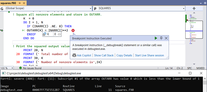 The program now generates better results. You can examine the values of both the input array INARR (read from the file) and the output array OUTARR that the program calculates. In the Text Editor window, the previously set breakpoint remains set.
