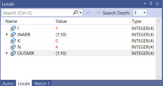 Also drag the OUTARR array name to the Watch window. Click the Plus sign (+) to the left of the OUTARR variable's name to display the values of its array elements.