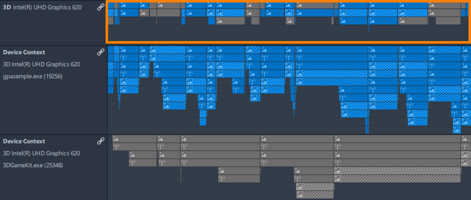 If rendering in your graphics application is visibly slow, explore GPU and CPU queues available in Graphics Trace Analyzer to determine whether your application is GPU-bound or CPU-bound.