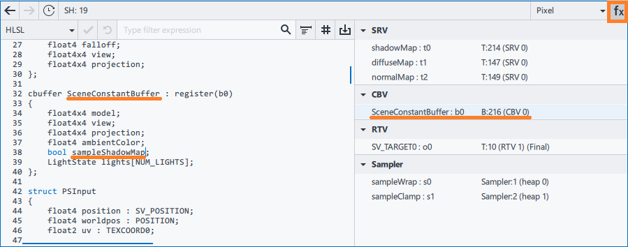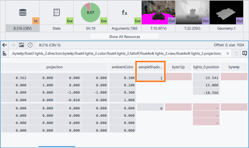 166 if (sampleShadowMap && i == 0) 167 { 168 lightPass *= CalcUnshadowedAmountPCF2x2(i, input.worldpos); 169 }sampleShadowMap is a constant from SceneConstantBuffer. To view the constant buffer content, open the Shader Resource list by clicking the