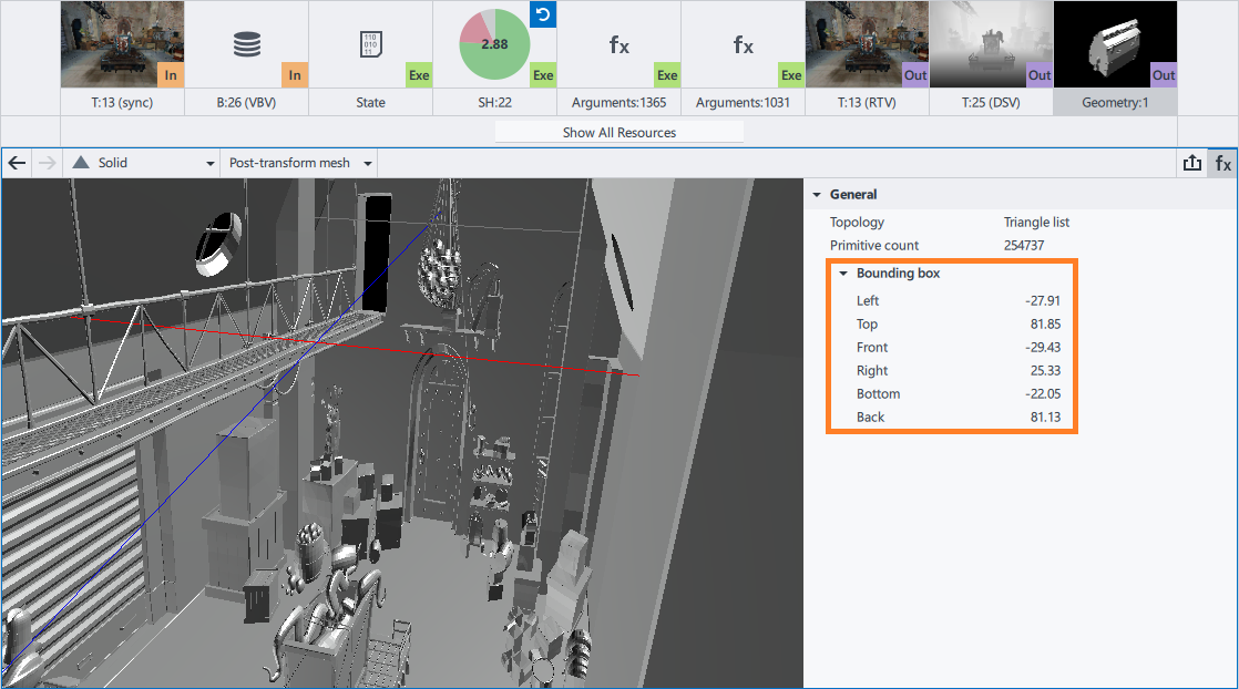 Open the event with the discovered Shader Execution bottleneck in the Graphics Frame Analyzer Resource Viewer by selecting this event on the Bar Chart.