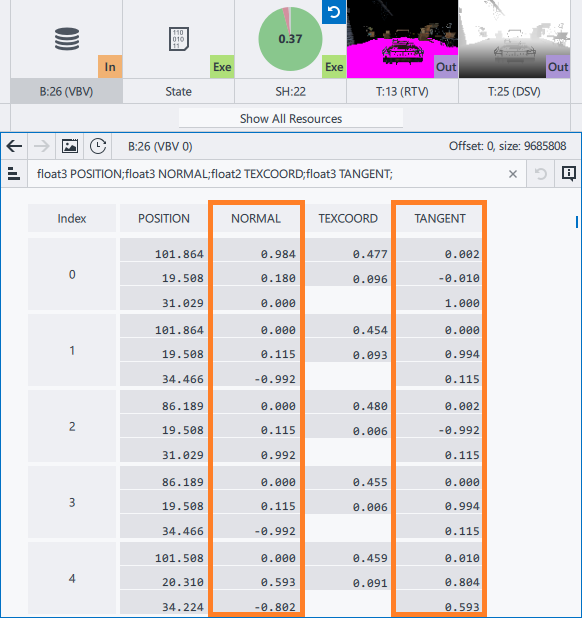 58 vVertNormal = normalize(vVertNormal); 59 vVertTangent = normalize(vVertTangent); 61 float3 vVertBinormal = normalize(cross(vVertTangent, vVertNormal)); 87 float fCosAngle = dot(vLightToPixelNormalized, vLightDir / length(vLightDir));You can find a vertex buffer in the Graphics Frame Analyzer in the same way as the constant buffer content using the Shader Resource panel. If you look at the vertex buffer content, you can see that Normal and Tangent vertex attributes are normalized on the CPU and therefore can be removed from the shader code.