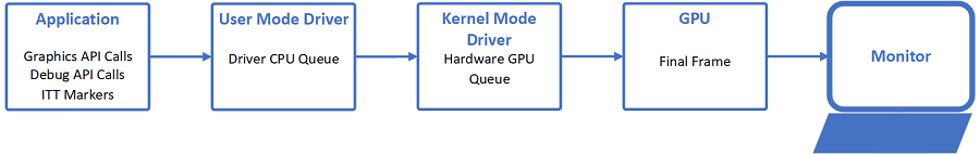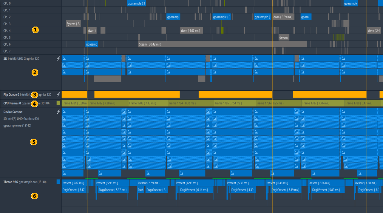 Each Graphics Trace Analyzer track shows specific performance events generated by your application and system at subsequent stages of graphics command execution: