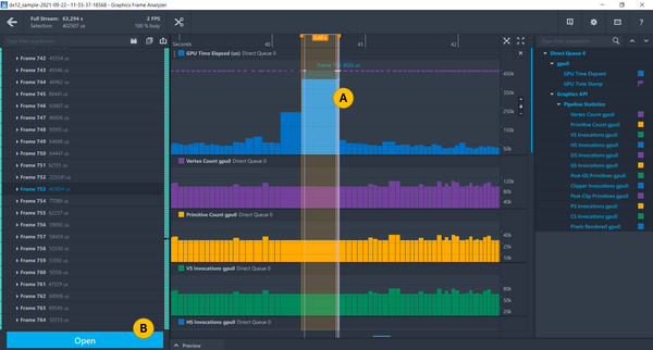 For detailed analysis, open a frame that appears to perform poorly. For example, identify the longest frame by analyzing the GPU Time Elapsed metric, which shows the amount of time spent on frame rendering: