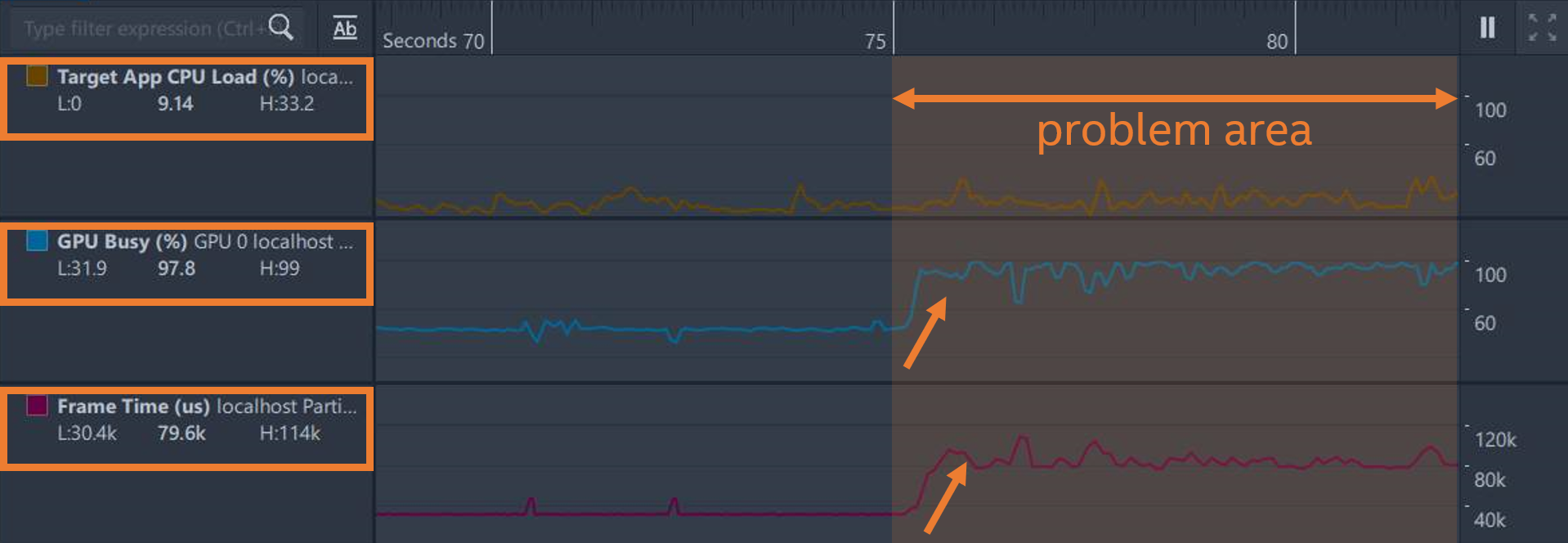 Problem scenes are when the game is slow to render specific objects, textures, new locations. Imbalanced CPU and GPU workload also indicates performance issues. For example, do not have the GPU running at 100% while the CPU is only 20% utilized, and vice versa.