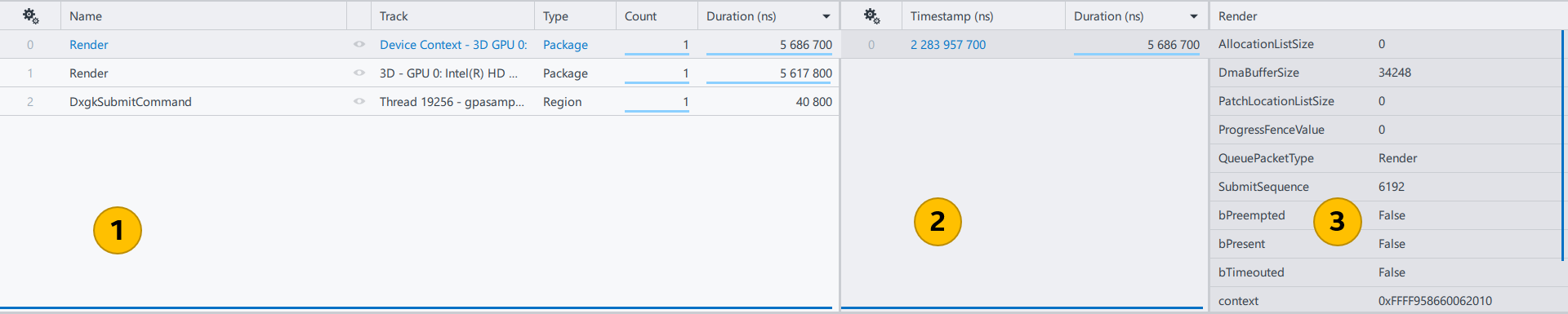 Selecting any of these packages shows an arrow that reveals calls in CPU threads related to that package. For example, you can trace the origin of a Render package from the CPU thread, to the User-Mode Driver, and up to the hardware queue.