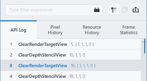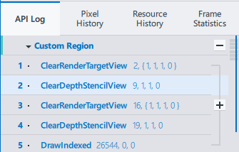 NOTE:By default, the API Log tab shows only graphics API functions that produce any GPU activity, such as draw calls or clear calls. These graphics API functions are also called "events".