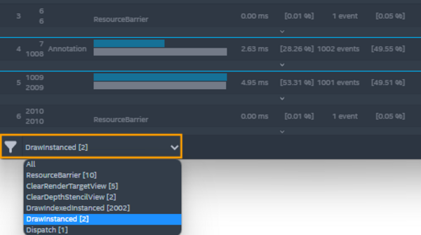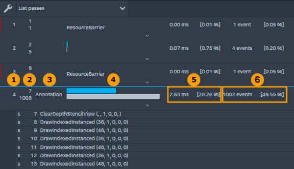 Use the Expand button to see the list of graphic events in the render pass. All events that perform reads from CPU-produced resources are marked with s on the left. Additionally, Resource Barriers are marked with a red bar on the left.