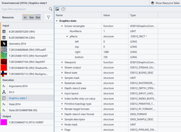 Graphics pipeline states used by draw calls. You can modify these states directly in the Graphics Frame Analyzer and see how these modifications might improve your application performance.