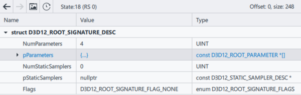 This resource view enables you to explore the internals of DirectX 12 Root Signatures and Vulkan Descriptor Sets. This can be useful for debugging sporadic rendering issues, like a wrong texture being used for an object.