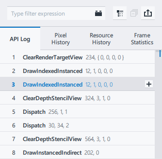 By default, the API Log tab shows only graphics API functions that produce any GPU activity, such as draw calls or clear calls. These graphics API functions are also called “events”.