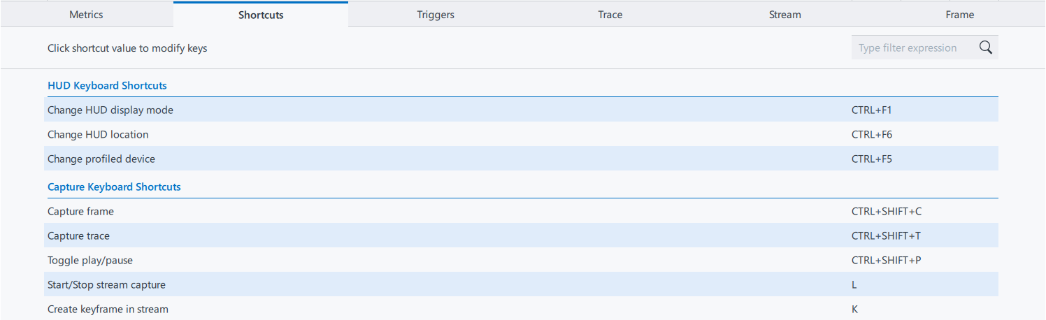 Metrics: choose metrics to be displayed in the Heads-Up Display (HUD) in the target application, customize the HUD position, and configure metrics collection.