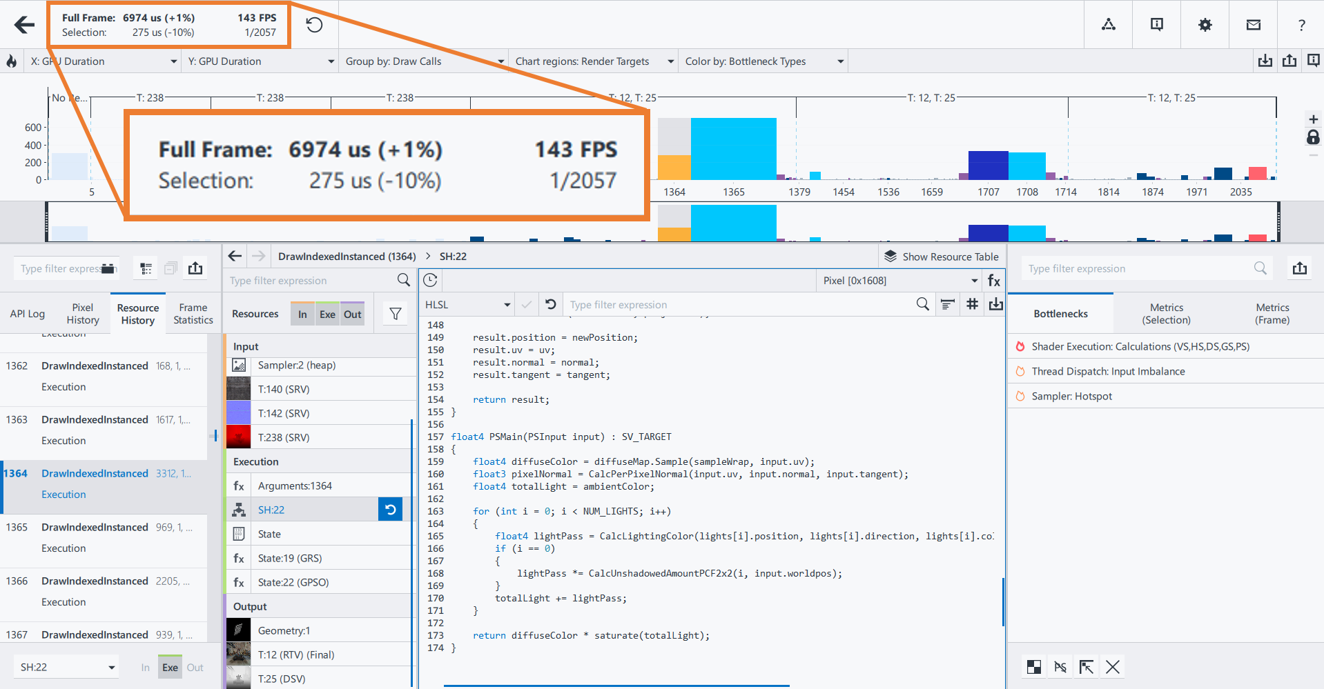 To determine whether shaders cause a performance bottleneck for the selected draw calls, refer to the Bottlenecks tab of the Metrics pane (