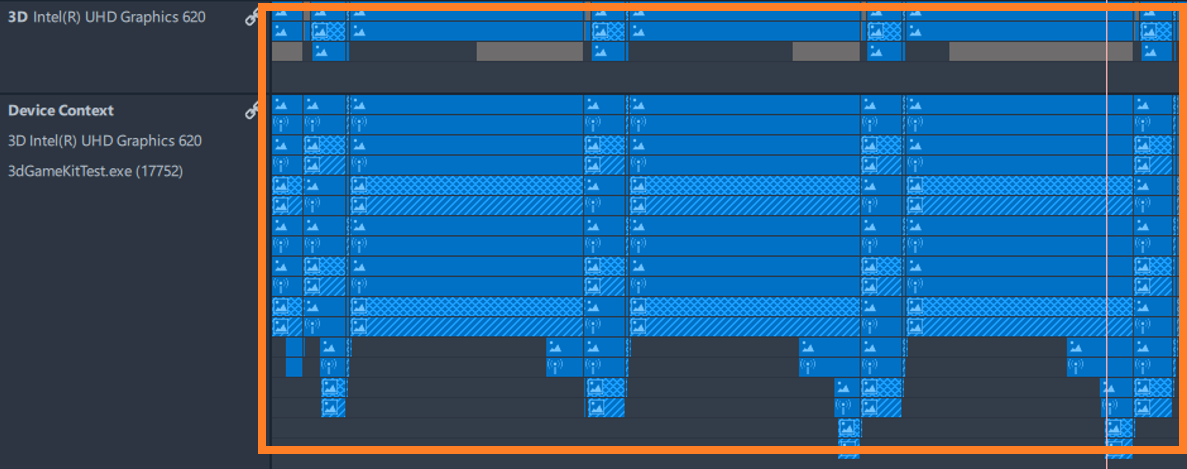 If frame duration varies greatly, you can spot anomalies with Graphics Trace Analyzer: analyze API calls, parallelization, synchronization, ETW events, and debug API markers in more detail.