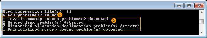 By default, a Summary report is automatically generated and saved after a result is created. Here is a Summary report displayed in stdout, with a breakdown by state of memory problems found in the myRes007mi2 result: